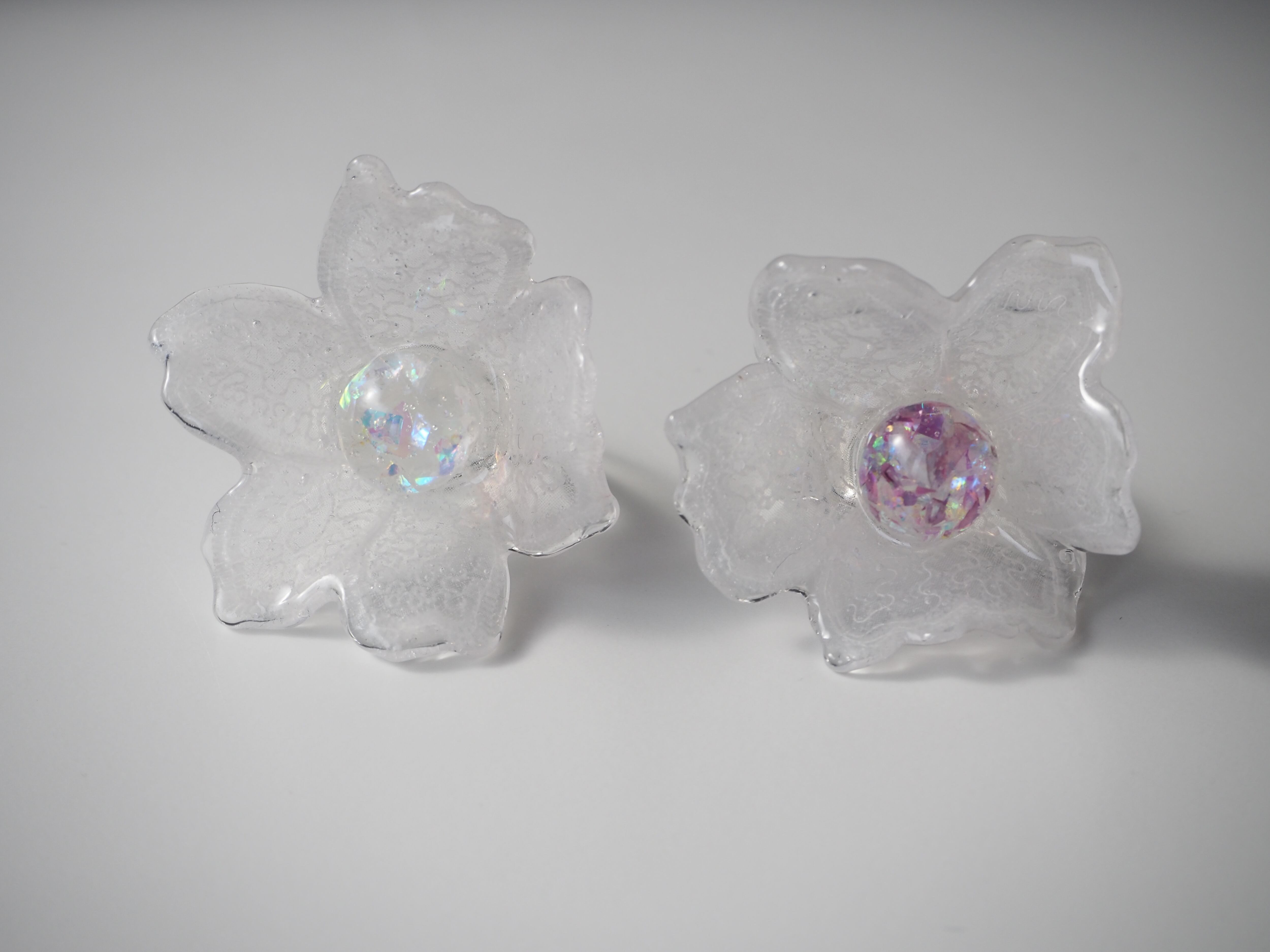 花びらには薄いレース模様が浮かび上がり、中心には光を閉じ込めたようなカラフルなラメが輝きます。