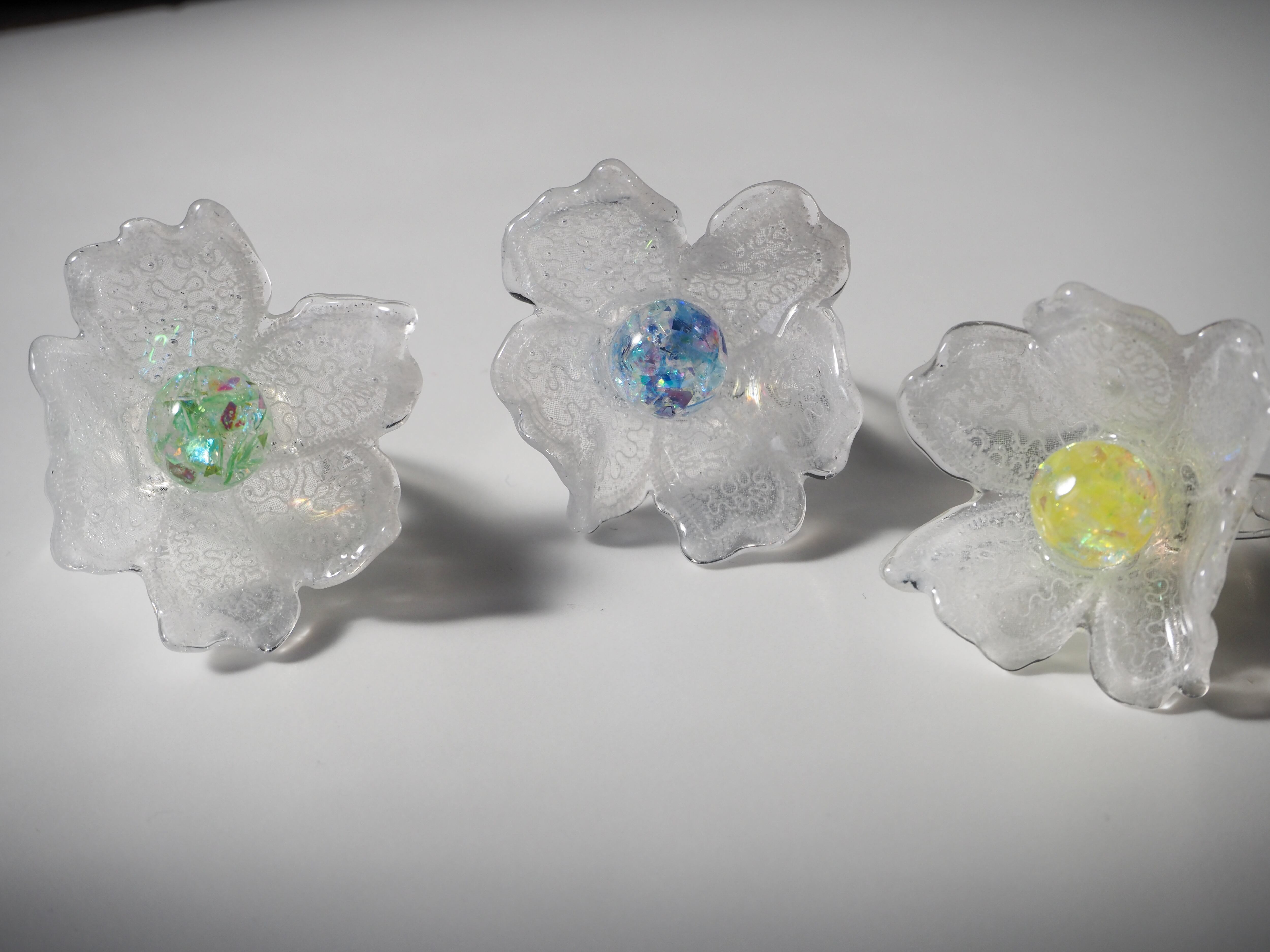 樹脂を一枚一枚曲げてつくる、繊細な花のリング。