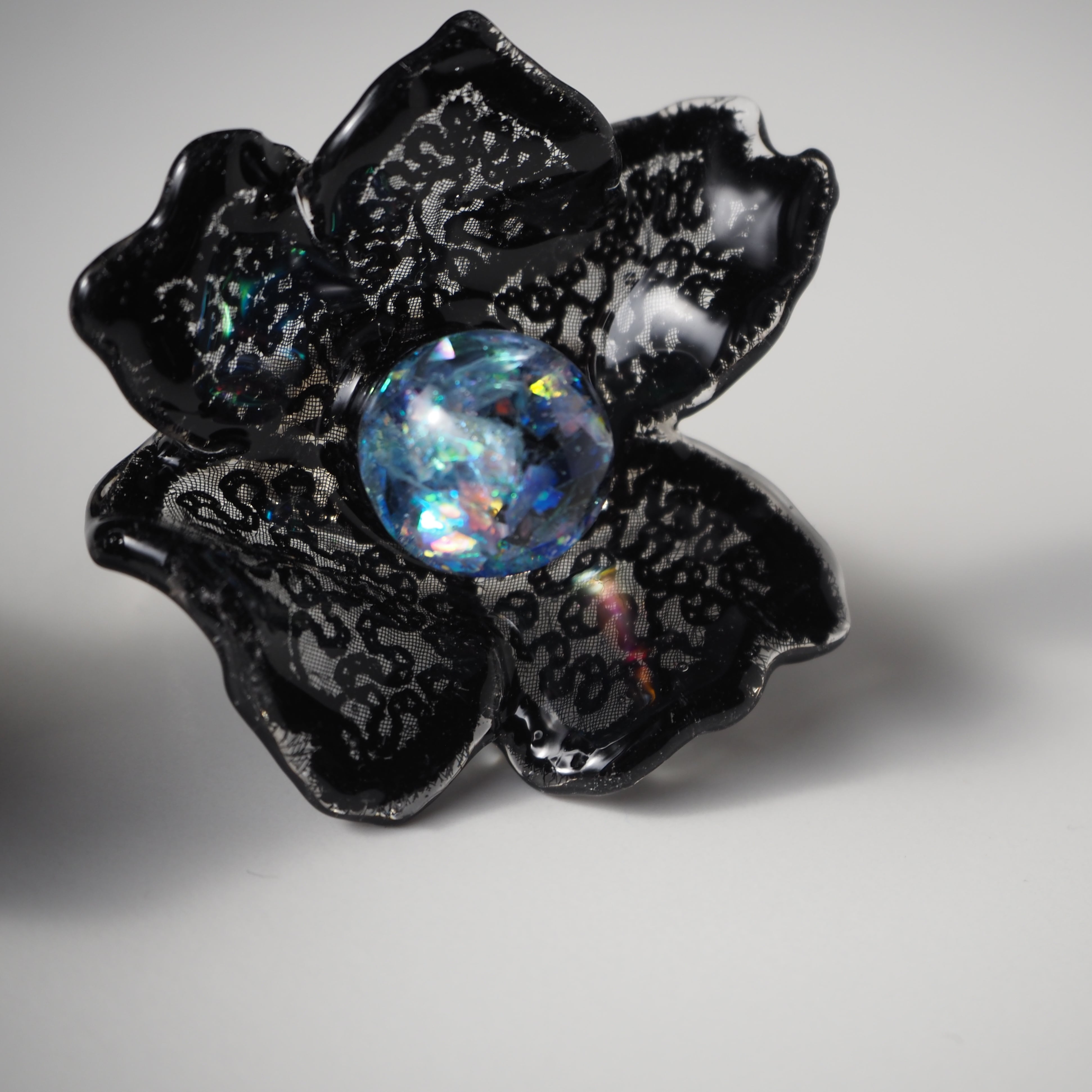 花びらには薄いレース模様が浮かび上がり、中心には光を閉じ込めたようなカラフルなラメが輝きます。