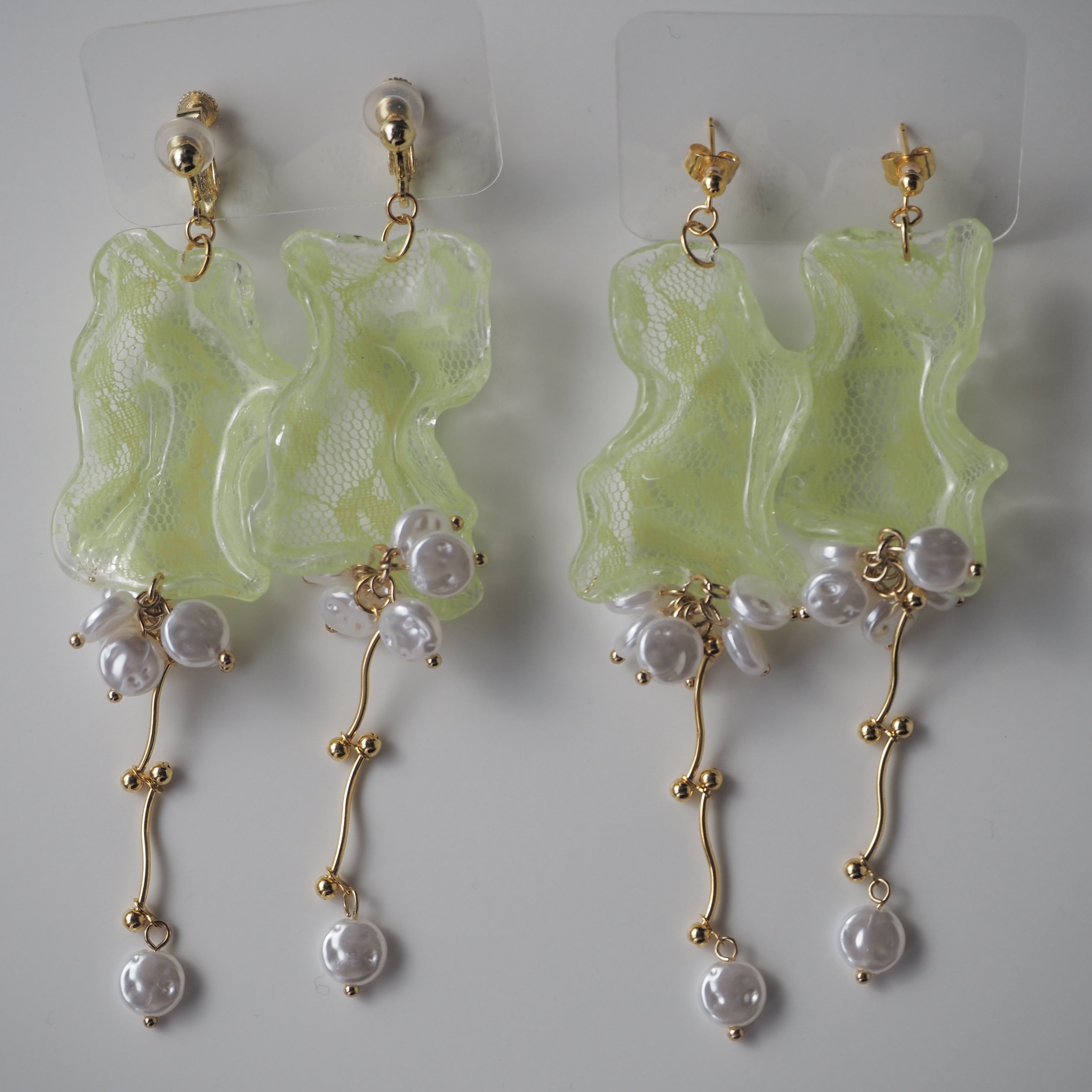 繊細なレースを樹脂の中に閉じ込め、光に透けるやわらかな模様とゆらぎのあるフォルムを